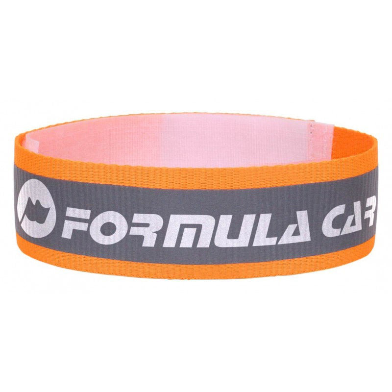 A 18 inch long x 1/2-inch wide armband with a 7/8-inch wide reflective strip down the middle. Includes 5 inches of hook and loop to adjust the length for most adults. Printing is on the reflective strip. Length can be adjusted smaller for children.