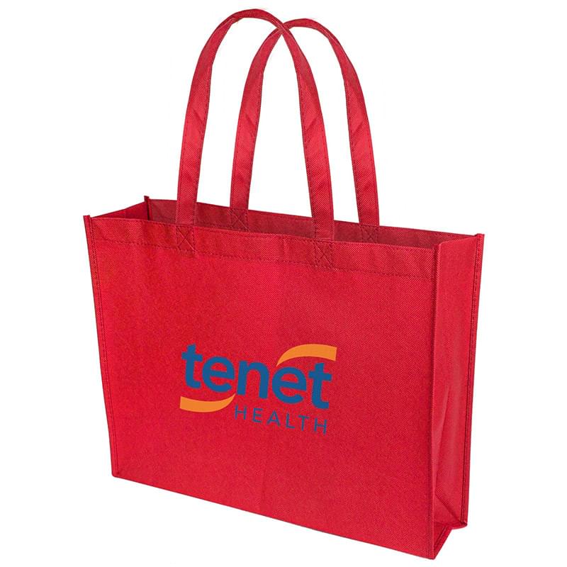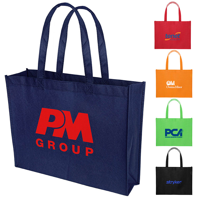 Non-woven 80GSM material. Durable stitched handles. Eco-friendly. Polypropylene, made of 100% recycled materials.