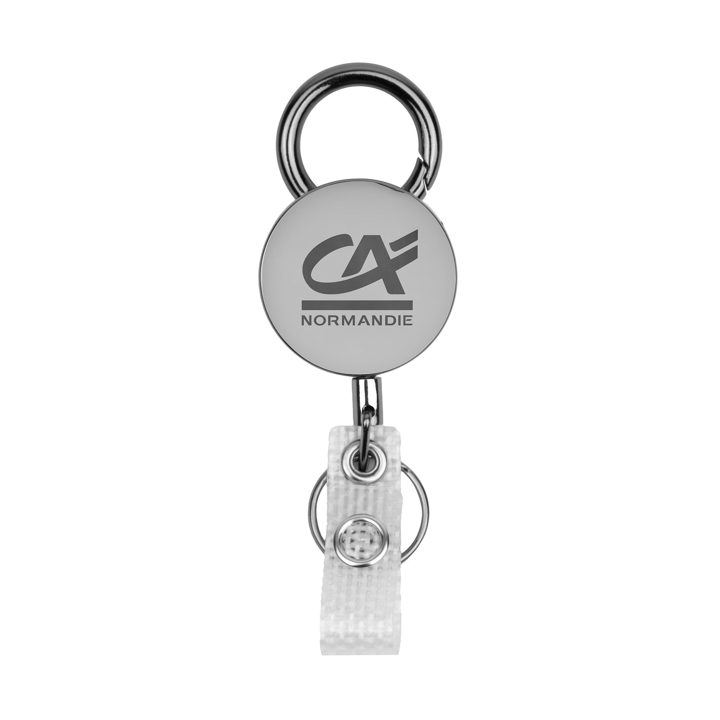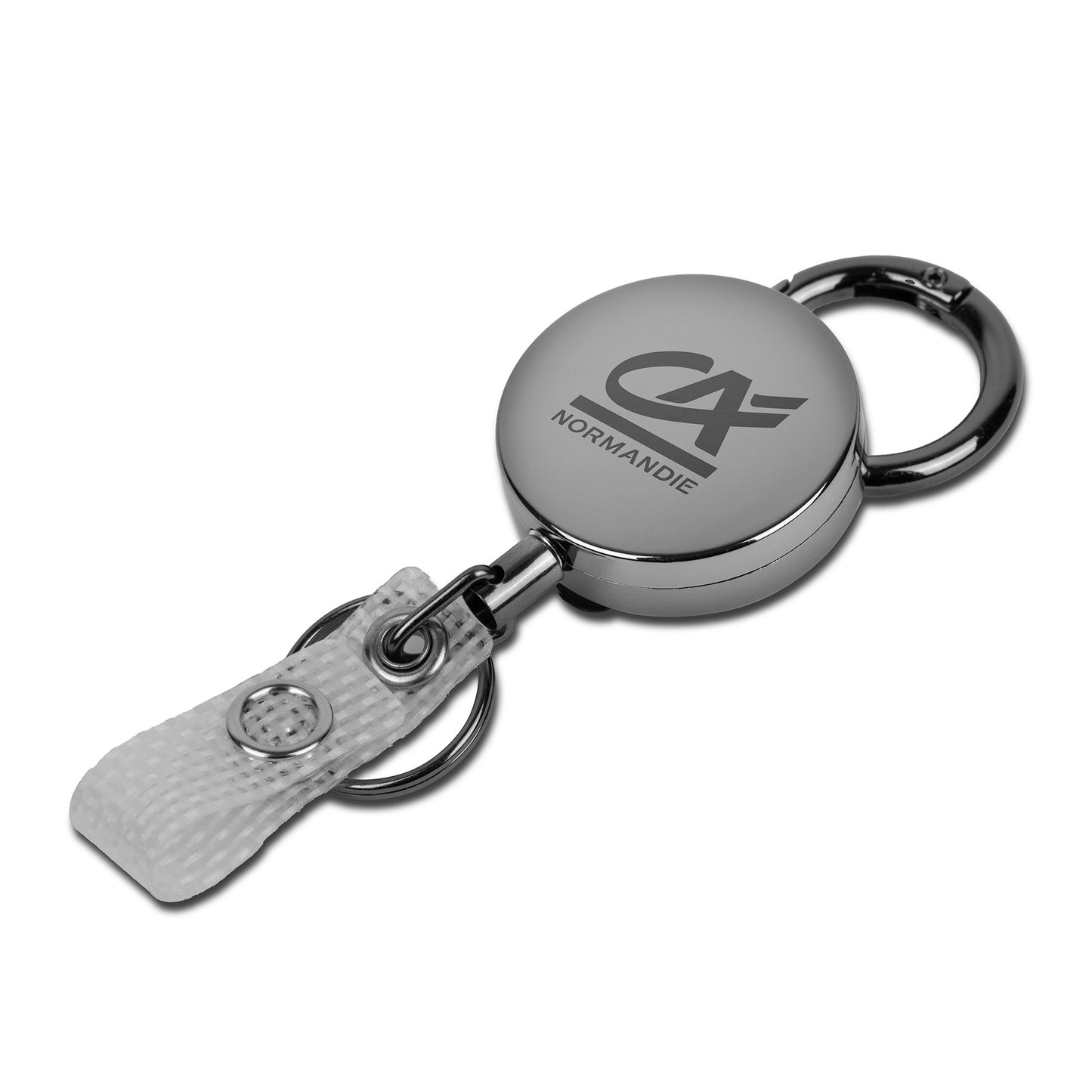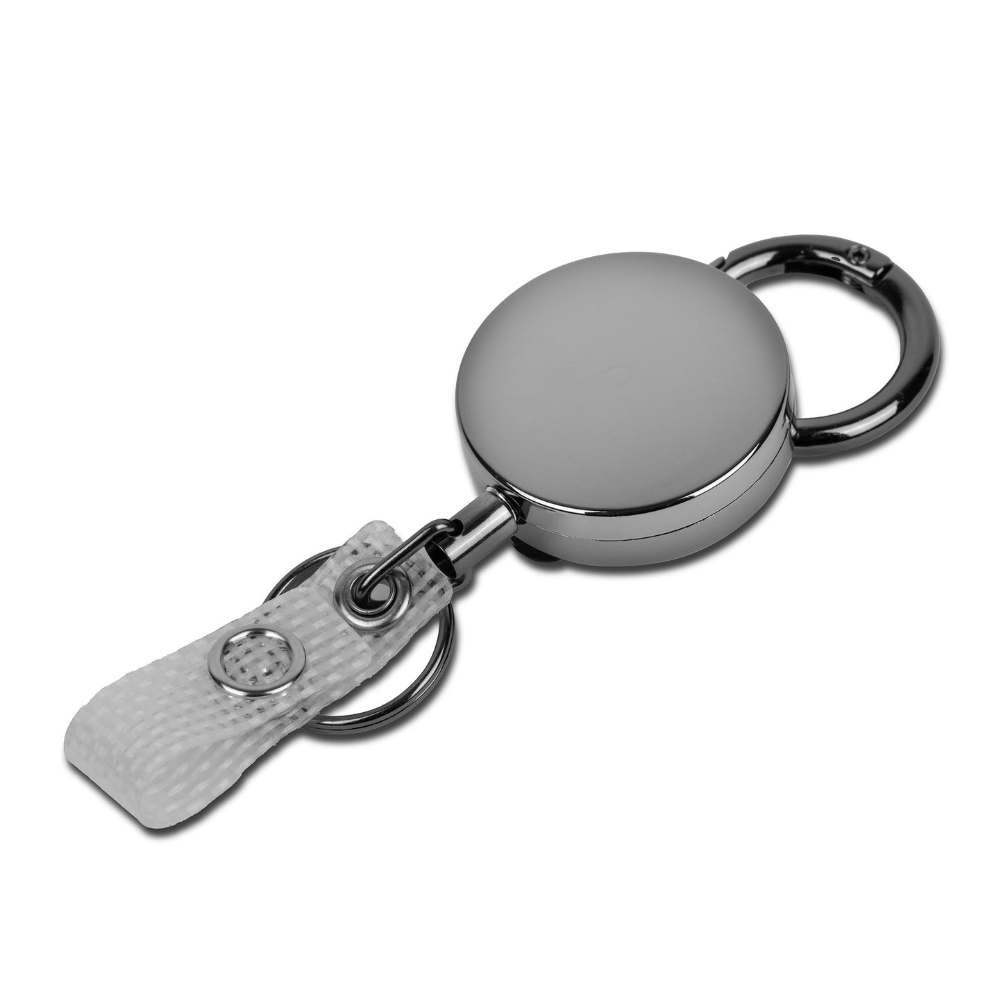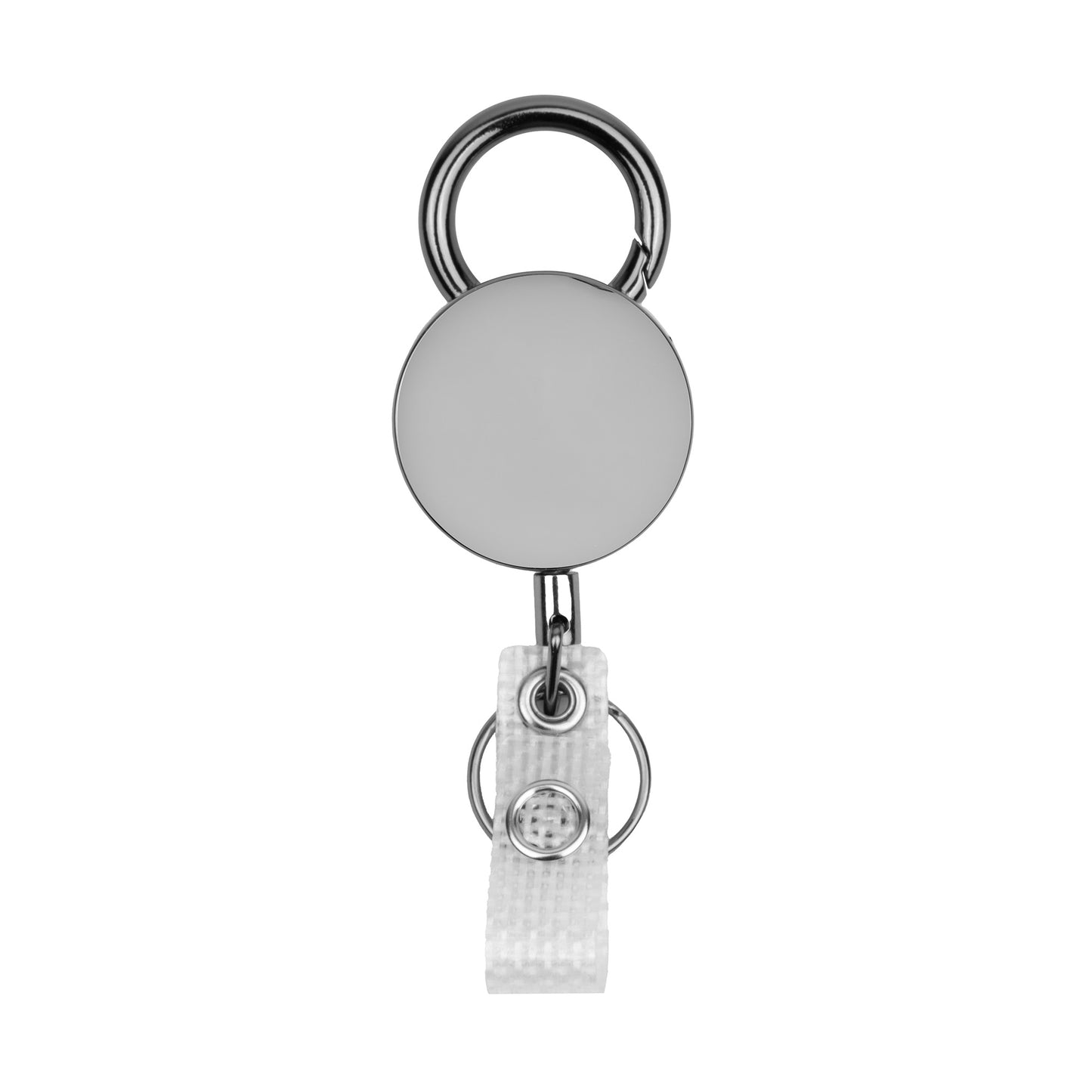 The Round Metal Retractable Badge Reel with Carabiner O-ring combines functionality and strength with a zinc alloy body, polyester rope, and PVC button. Its durable steel clip ensures secure attachment, making it perfect for convenient badge or key access in any professional setting.