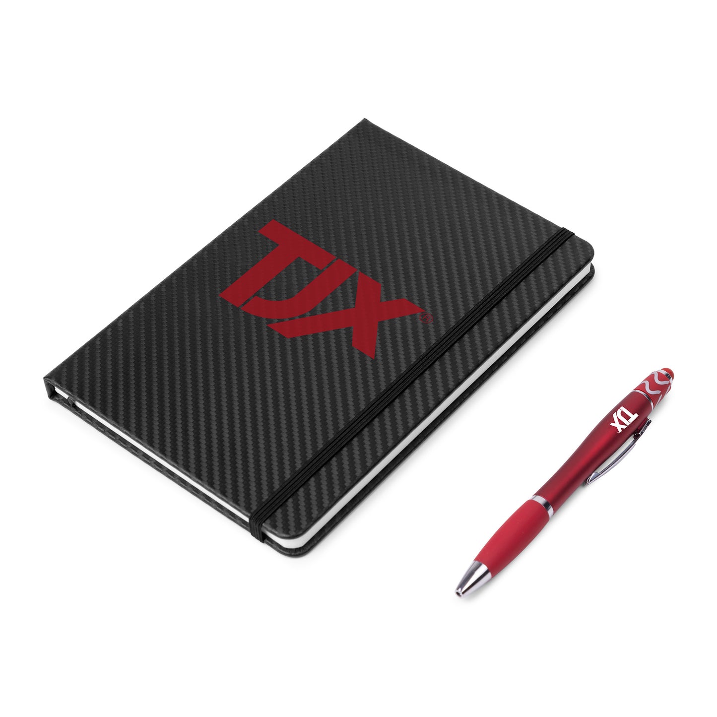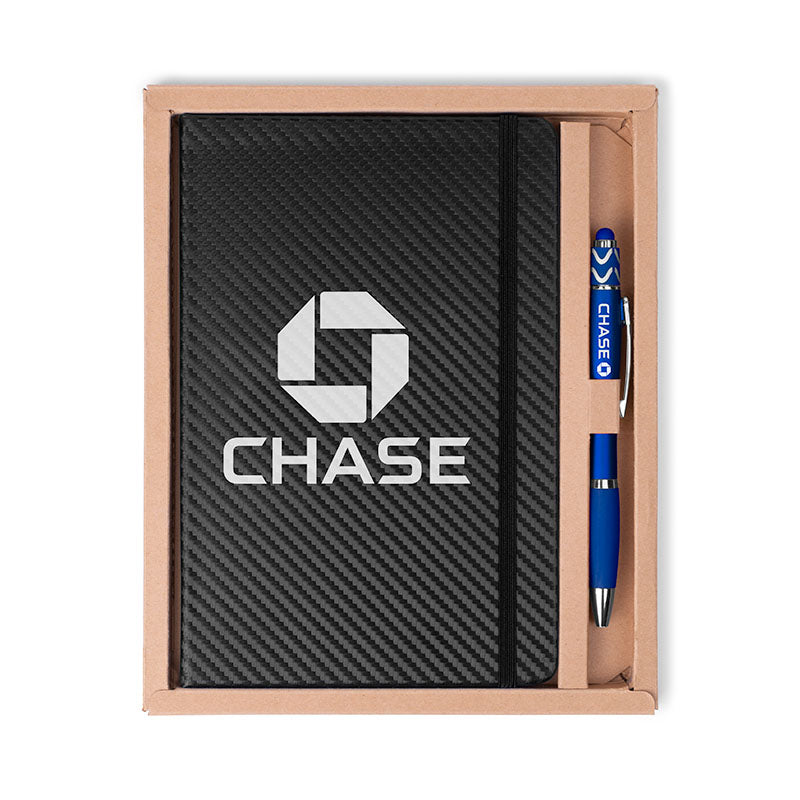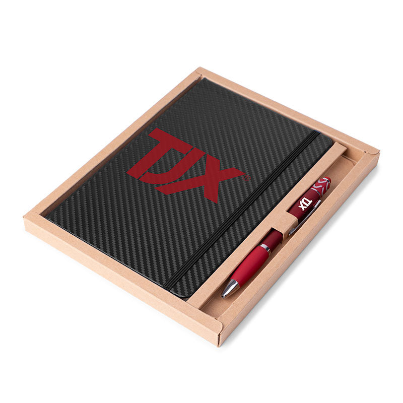 A great gift set, combining class and elegance into one sophisticated package. This giftset includes the JT105 Carbon Fiber Journal Notebook and P730 Spinner Fidget Pen. The journal features polyurethane faux carbon fiber covers and 80 pages of 70-gram paper. The Fidget pen features a contoured plastic barrel with twist-action mechanism, stylus and spinning fidget toy. Presented in a sleek, eco-friendly kraft paper box.