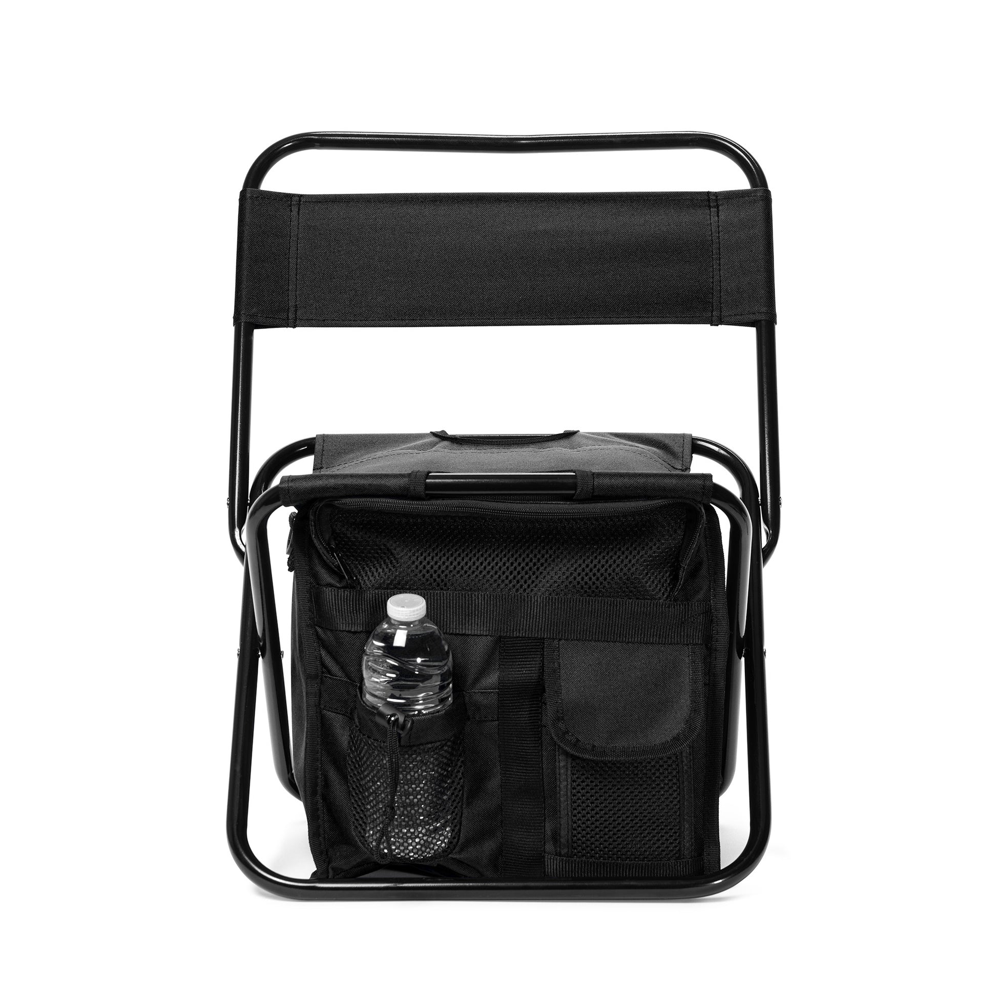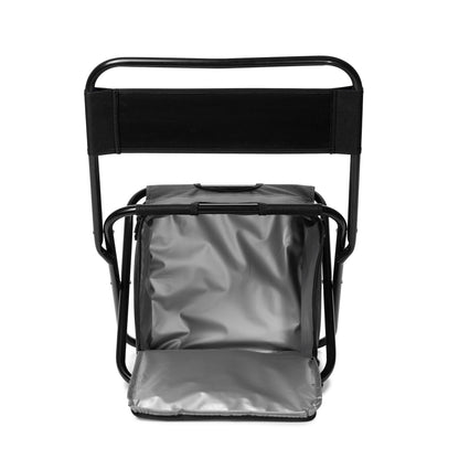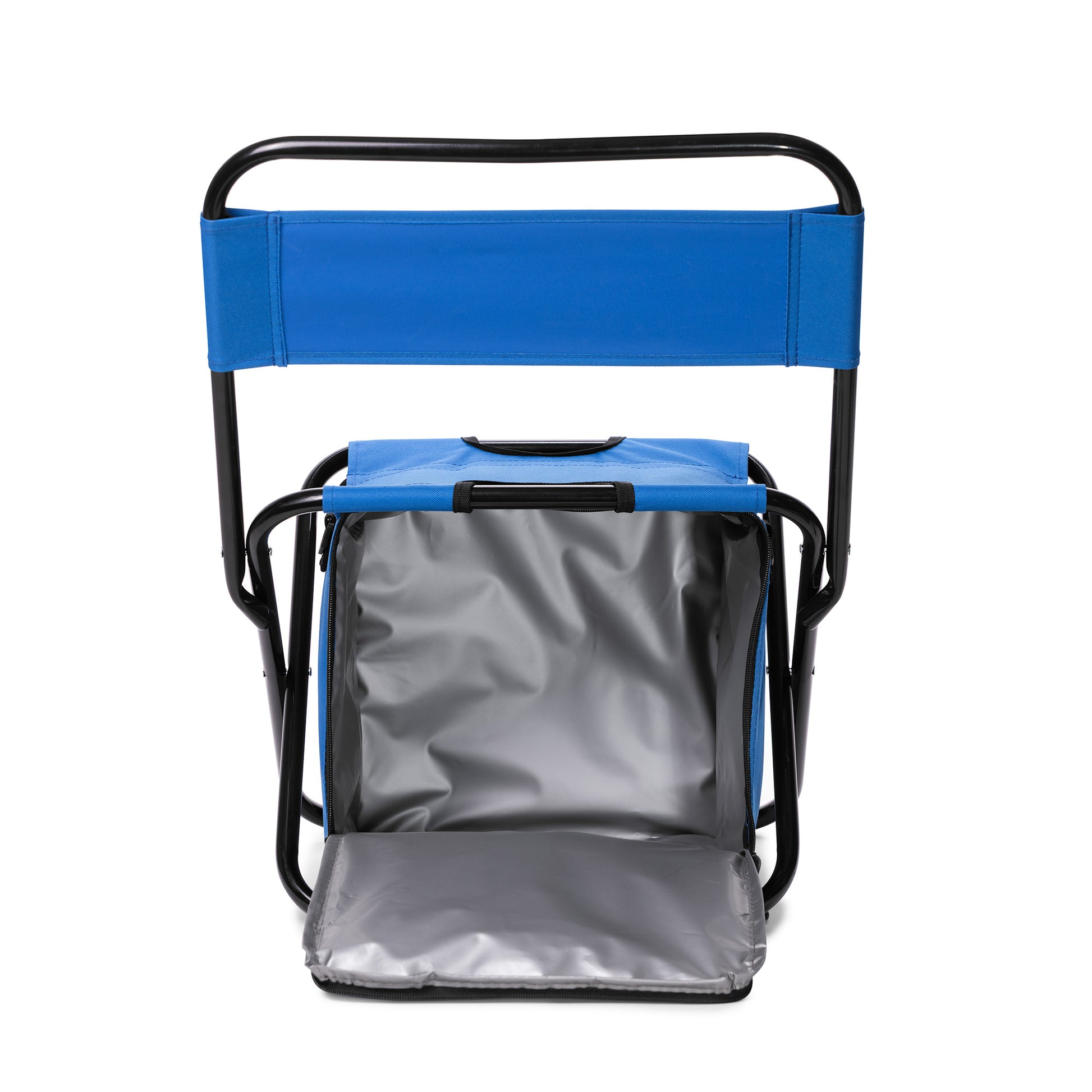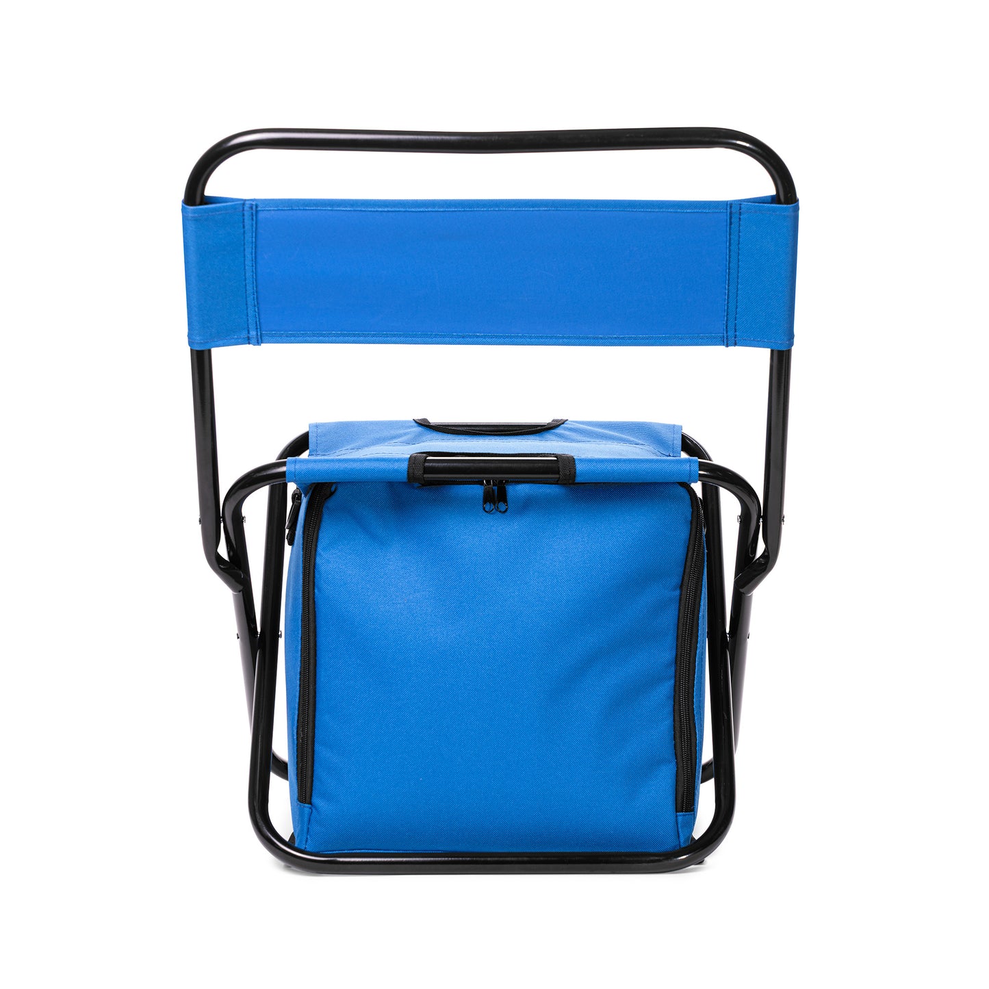 A durable 16mm steel frame and 600D polyester oxford fabric make this cooler chair both sturdy and functional. Features a 24-can PEVA-lined main compartment, zippered front pocket, mesh water bottle pocket, gusseted front pocket, and a removable 1.5" x 50" padded shoulder strap. Supports up to 286 lbs.