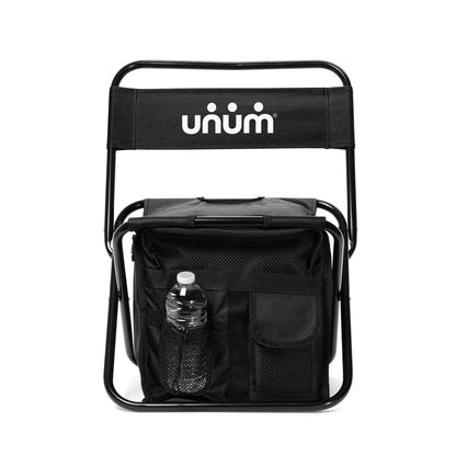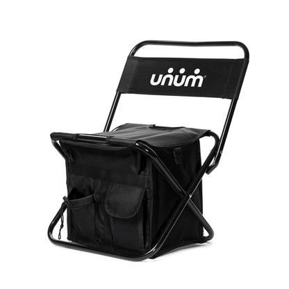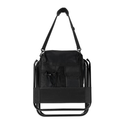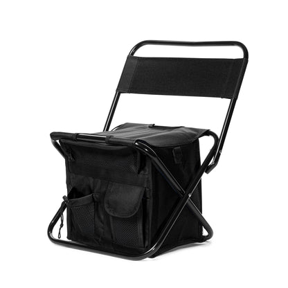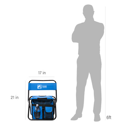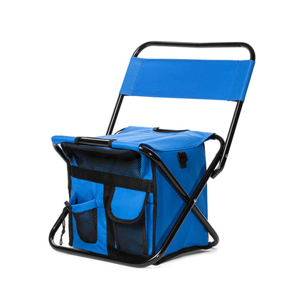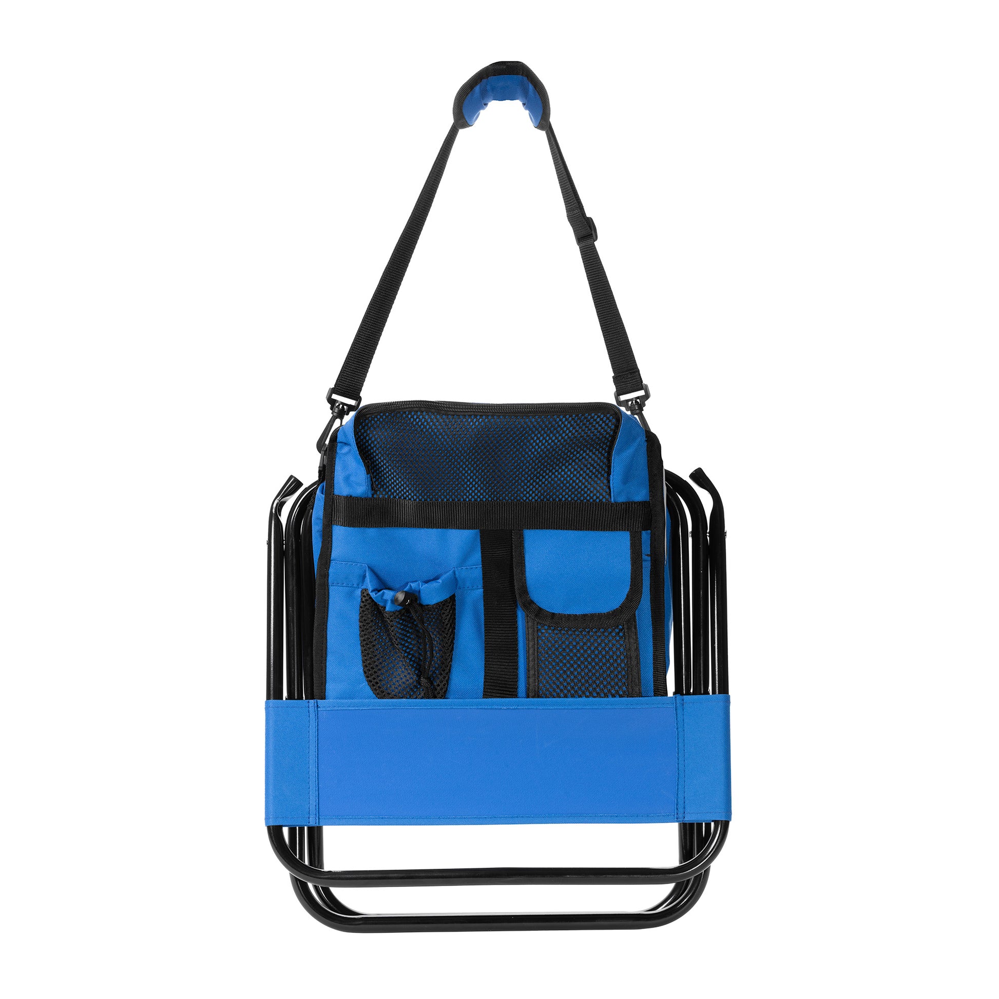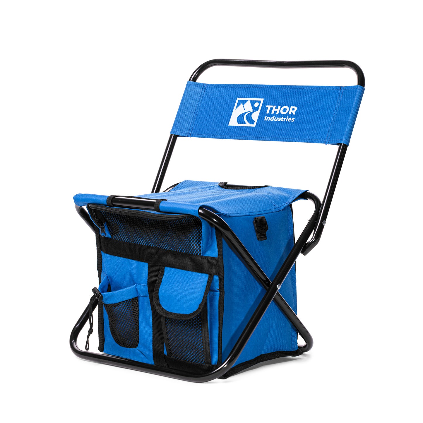 A durable 16mm steel frame and 600D polyester oxford fabric make this cooler chair both sturdy and functional. Features a 24-can PEVA-lined main compartment, zippered front pocket, mesh water bottle pocket, gusseted front pocket, and a removable 1.5" x 50" padded shoulder strap. Supports up to 286 lbs.