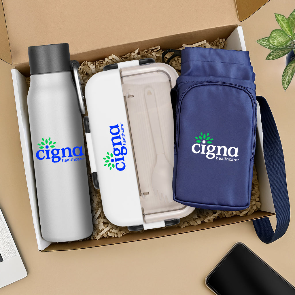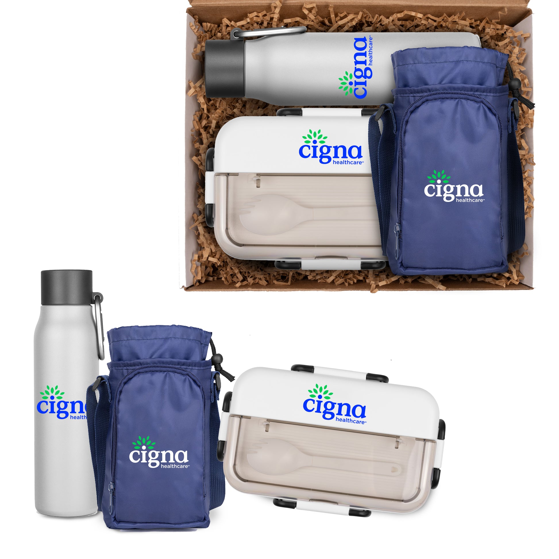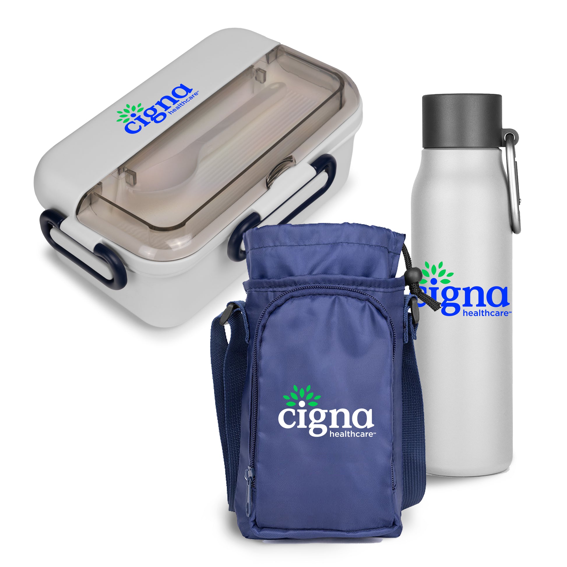 Price Includes: A one-location imprint on the bottle, lunch box and sling bag