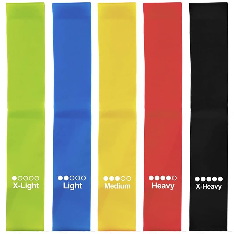 Get a great workout by utilizing these bands, which give you different results based on their varying thicknesses. Manufactured out of durable TPE (thermoplastic elastomer). Bands feature convenient resistance levels stamped onto the TPE. Each band is 12 inches long when laid flat and can be easily store in the accompanying pouch: great for traveling. Imprinting on polyester pouch only. Resistance Strength of each Color Band: Green: 5 lbs, Blue: 10 lbs, Yellow: 15 lbs, Red: 20 lbs, Black: 25 lbs.